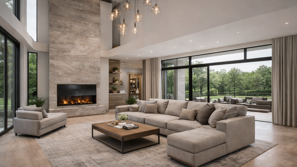 This project showcases a contemporary luxury villa defined by open spaces, natural light, and refined materials. The open-concept layout seamlessly connects living, dining, and kitchen areas for modern living. Private spaces are designed for comfort and calm, featuring a spa-inspired ensuite and cohesive design throughout.